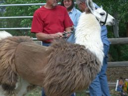 If the animal is suffering from heat stress or it is very hot or humid, shear at least the barrel or mid section. The llama in this photo has had the minimal amount shorn. This can be done using electric clippers or hand shears.
